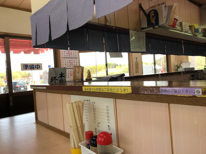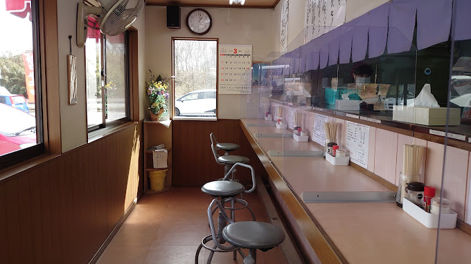プレハブの店舗はカウンター席が中心で、アクリル板で仕切られた安全な空間。地元の方が多く、居心地の良い雰囲気です。現金のみの支払い、セルフサービスでスムーズに楽しめます。