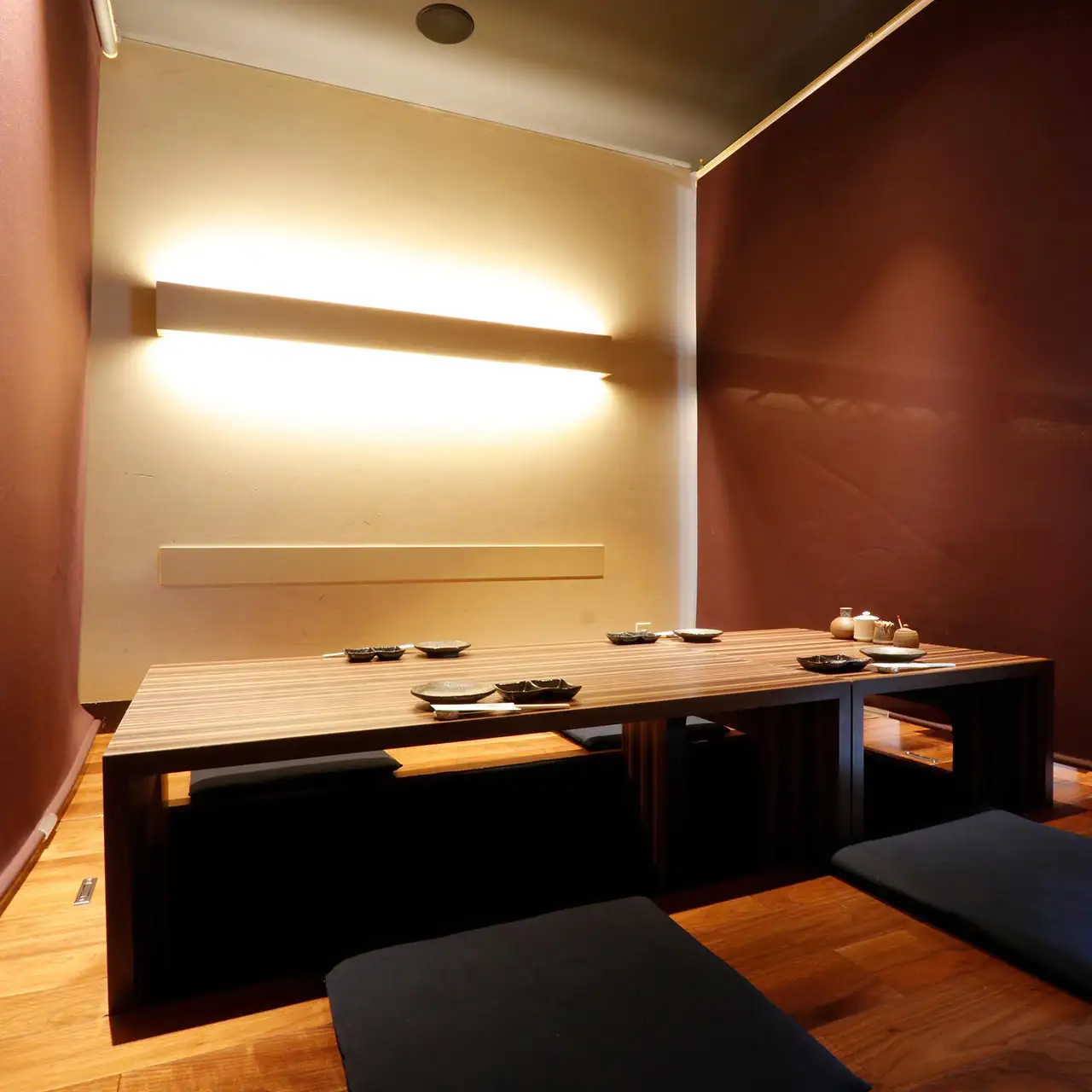 落ち着いた和の雰囲気のある掘りごたつのお座敷席は、パーテーションで間仕切りができ、お客様の人数に合わせたレイアウトが可能です。また、他のお客様とのソーシャルディスタンスを保つようにお席を配置いたしますので、安心してお過ごしいただけます。少人数のご宴会やご家族でのお食事にご利用くださいませ!