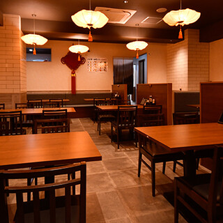 オレンジ色の布を使用したシェード付照明が印象的な店内。あたたかみのある落ち着いた雰囲気で、中国の風情を感じながらゆったりとお食事をお楽しみいただけます。お席はテーブル席のほか、中華らしい円卓テーブルもご用意。仕切りのある個室空間になるので、会社宴会やご家族でのお食事にも最適です!