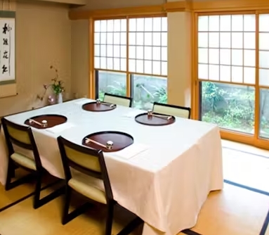 大切な席に相応しく品のある客室は落ち着いた雰囲気。イス席にてお楽しみいただくことも可能です。心穏やかにお過ごしいただける完全個室のお座敷席をご用意。四季の移ろいが美しい日本庭園を望む贅沢な空間で、ゆったりとしたひと時をお過ごし下さい。