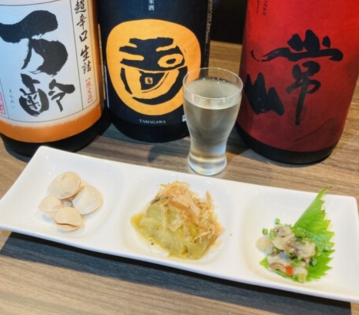 コンパクトながら隠れ家感のある店内は、一人飲みからデート、二軒目利用まで幅広く対応。日本酒は一杯1,200円から、飲み放題プランもあり気分に合わせて楽しめます。日本酒以外のお酒も用意されており、誰と来ても満足できる使い勝手の良さが魅力です。