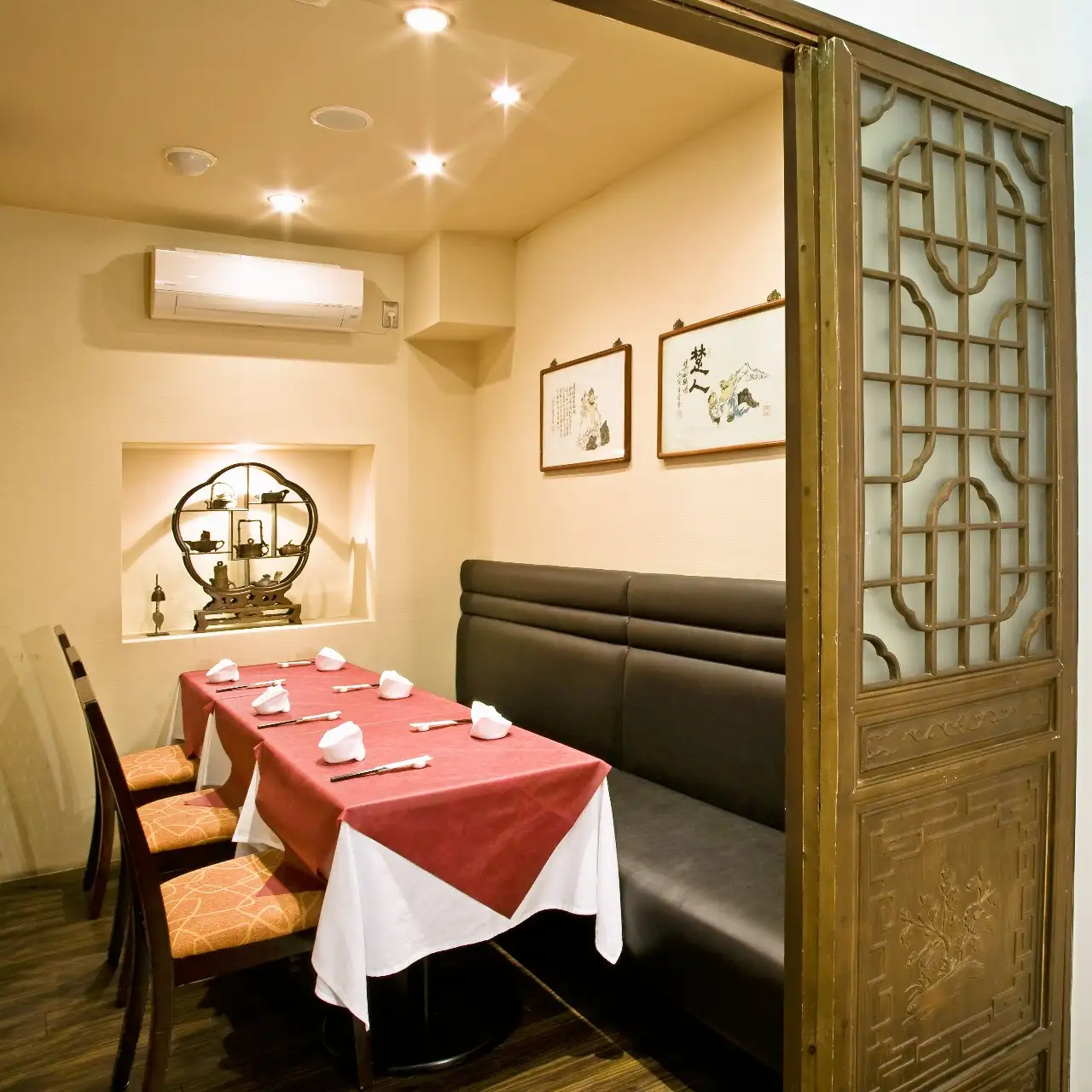 中国の陶磁器や絵画の装飾品が華やかな店内は、ゆったりとお過ごしいただける和やかな雰囲気。ご家族やご友人とのお食事に最適なテーブル席をご用意しております。接待や会食、記念日など特別な日のお食事には、6名様までご利用可能な個室をどうぞ!