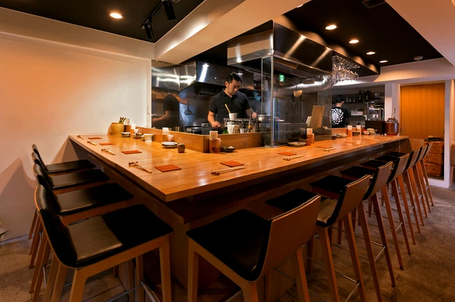 カウンターテーブルは奥行きが広めでゆったりとしています。オープンキッチンは、調理の様子やスタッフとの会話が楽しめるのが利点。一人静かに飲みたい夜にもおすすめの大人たちが集うお店です。また、特別なデートの夜に相応しい、JAZZの流れる落ち着いた雰囲気です。