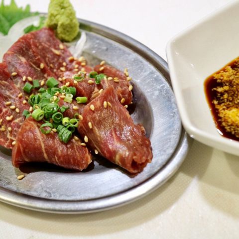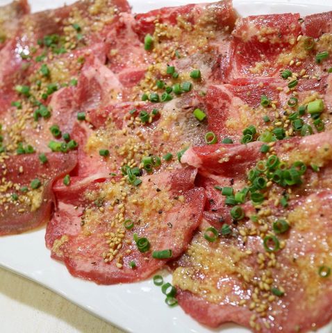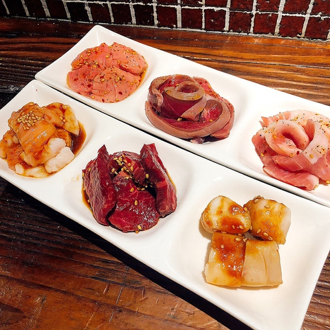 しっかり《お肉》を食べたい人におすすめ★赤身はハラミ/カルビ、ハツの3種類!!その日に入荷した各部位、数種類の中から選りすぐりのおまかせ盛りです◎/新鮮レバテキは旨ネギゴマ塩味です♪(※必ず焼いてお召し上がりください)