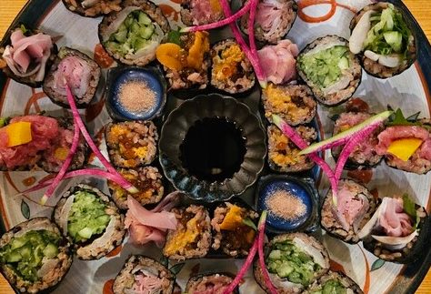 ユニークなメニュー表と、見た目にも美しい料理の数々。華やかな刺身や巻物、珍しい食材まで取り揃えています。お酒の種類も豊富で、豊かな味わいをお楽しみください。
