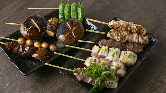 焼き鳥にはすべて山梨県産の健味どりを使用しています。健味どりは臭みがなく、旨味が凝縮された銘柄鶏。お得な盛り合わせもございます!