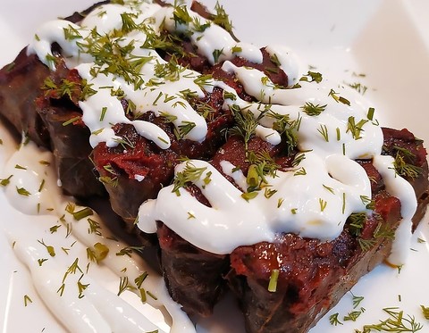 モルドバの葡萄の葉の中に豚肉、野菜、お米で包まれてトマトソースでこんがりオーブン焼きして作られるモルドバの郷土料理!NOROC自家製サワークリームを付けてお召し上がりください。
