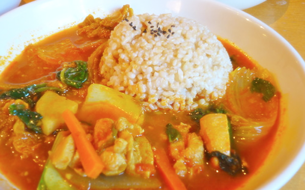 丼風ごはん。玄米とお味噌汁。野菜がメインのお惣菜の定食。スタッフが育て、調理します。これがほんとの自家製。おすすめはカムーカレー。動物性素材不使用、EXVオリーブオイル、スパイス、野菜の皮、ハーブを20種類以上使用した玄米にとてもよく合う薬膳的でもあるオリジナルオーガニックカレー。