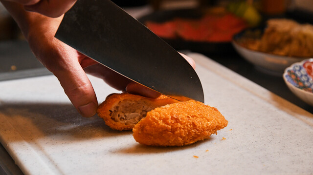 老舗精肉店が監修する確かな素材を使い、外はザクザク、中は肉汁たっぷりに仕上げたメンチカツが自慢。玉ねぎの自然な甘みと肉の旨みが調和し、食べ応えがありながら重たさを感じさせません。手作りのおばんざいと合わせて楽しめば、仕事帰りの一杯がぐっと充実します。