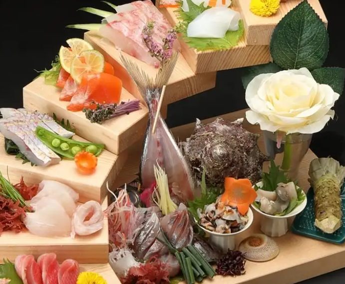 伊豆近海や全国の市場から目利きで仕入れる鮮魚を、贅沢な味わいでご提供。名物の「金目鯛姿煮」や「豪華お造里階段盛り」は素材の良さが際立つ逸品。高品質な料理をリーズナブルに楽しめるのが魅力です。