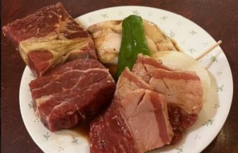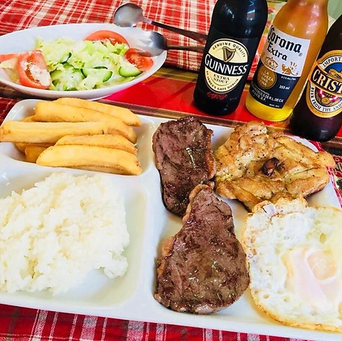 ビーフステーキ、チキン、目玉焼きにサラダがワンプレートで一度に楽しめる一品。ボリュームたっぷりの人気メニュー♪