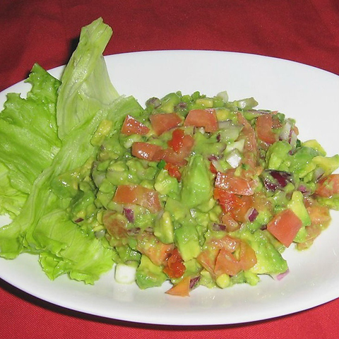 メキシコ料理。アボカド・赤玉ねぎ・パクチー・ビネガー・オリーブオイルを混ぜ合わせたお料理。トルティーリャに巻いてお召し上がりください♪