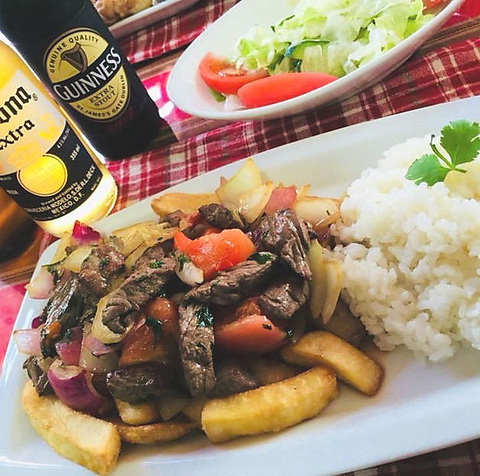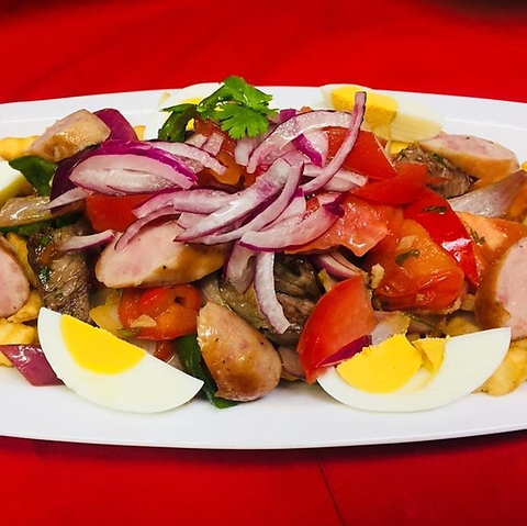 フライドポテト、牛肉野菜炒め、パクチー、チョリーソを合わせ、ゆで卵をトッピングした、彩り豊かなお料理。パクチーと特種な唐辛子(アリビビ)を使うことによって、さらに美味しさが増します!一皿2~3人分です。
