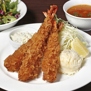 当店名物!!エビフライ3本入り!!チキンカツカレーや週替わりのハンバーグ、アンガス牛のハラミ丼、マグロのポキ丼。スープ、ドリンクもついて1000円税込み~です!丸の内でランチをお考えなら是非当店へお越しくださいませ!