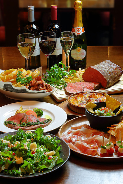 PCMで大人気のグルメコース!前菜盛合せ、ニューヨークスタイルケールサラダ、オニオンリング付きチキンバスケット、マルゲリータピザ、自家製ローストビーフ、プチシャーベット!