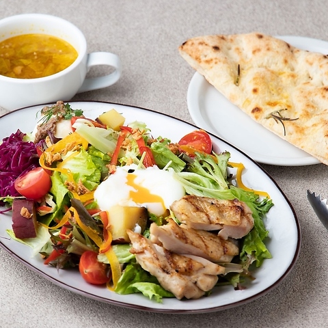 スープ、フォカッチャ付きのオトクなランチ!※本日のメインのサラダランチ※魚と食べるサラダランチの2種類からお選び頂けます。ドレッシングも3種から、お好きなものをお選び頂けます。・オニオンドレッシング・和風ドレッシング・サッパリニンジンドレッシング