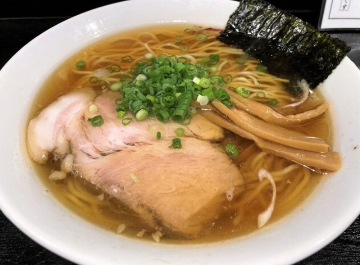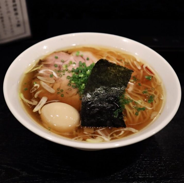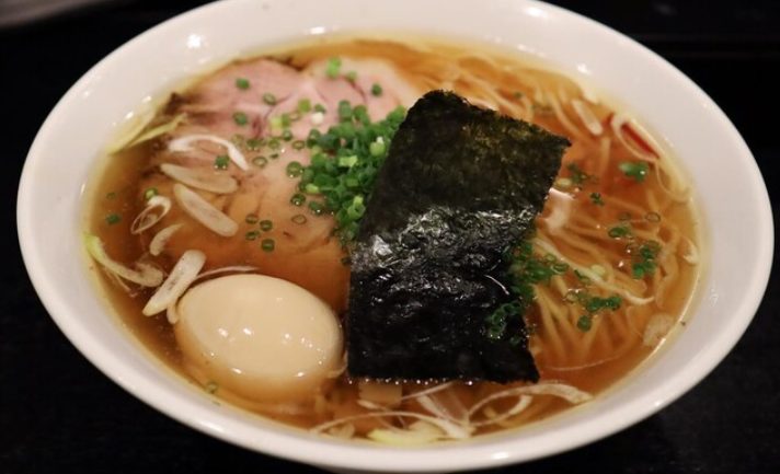 看板メニューは煮卵入りの鯖だし醤油ラーメン。丼から立ち上る鯖の豊かな風味が食欲をそそり、背脂の甘みが絶妙に調和します。中太ちぢれ麺がスープをしっかり絡め取り、最後の一口まで飽きさせません。飲み終わりにもぴったりな、満足度の高い一杯です。