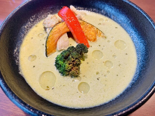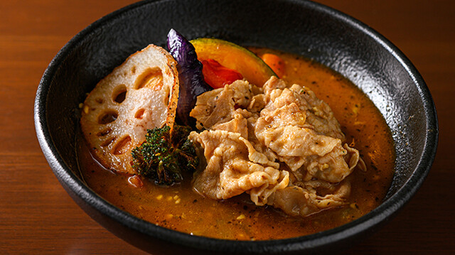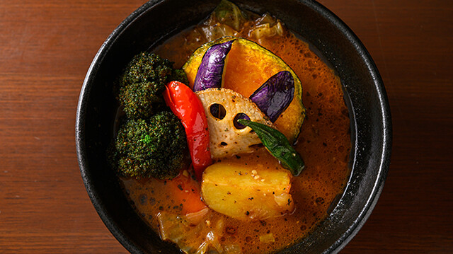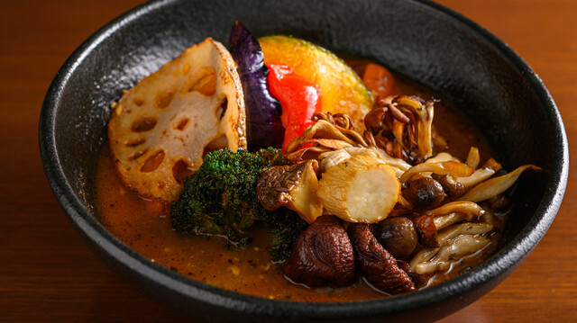 あの人気野菜が倍量になった野菜カレー!野菜でおなかいっぱいにしたい方へオススメです!野菜の甘みとスパイスの相性をご賞味ください!にんにくトッピングもオススメ♪お酒とも合うスープカレーです!