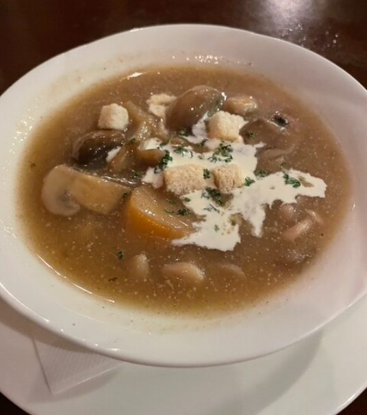 食事の始まりを彩るのが、深い旨みを湛えたきのこのポタージュスープ。やさしく染み渡る味わいで、空腹を静かに満たしてくれます。途中でチーズとライスを加え、リゾット風に楽しむのもおすすめ。ひと皿で二度美味しい、記憶に残る名スープです。