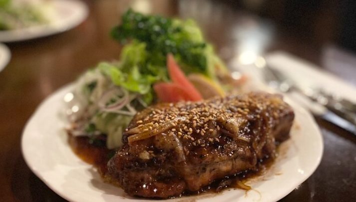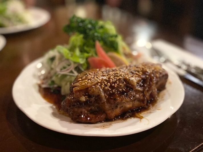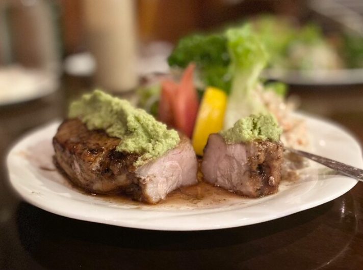 看板料理は、驚くほど柔らかく甘みのあるいも豚ロースのソテー。厚切りながら口の中でほどける食感で、塩わさび・ガーリック・ジンジャー・デミグラスなど、味ごとに異なる表情を楽しめます。特にコク深いデミグラスソースは秀逸で、付け合わせまで抜かりのない完成度です。