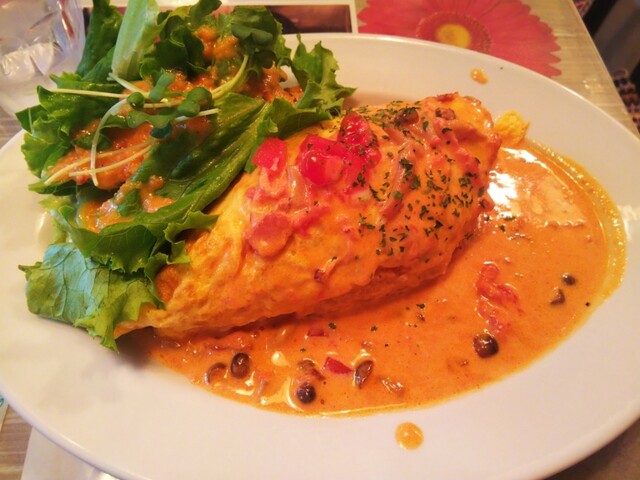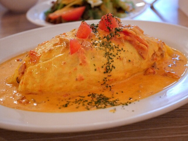 元祖エミリアソースが特徴のオムライスは、トマトソースとクリームチーズの絶妙な味わいが楽しめる一品です。デザートも全て自家製で提供。