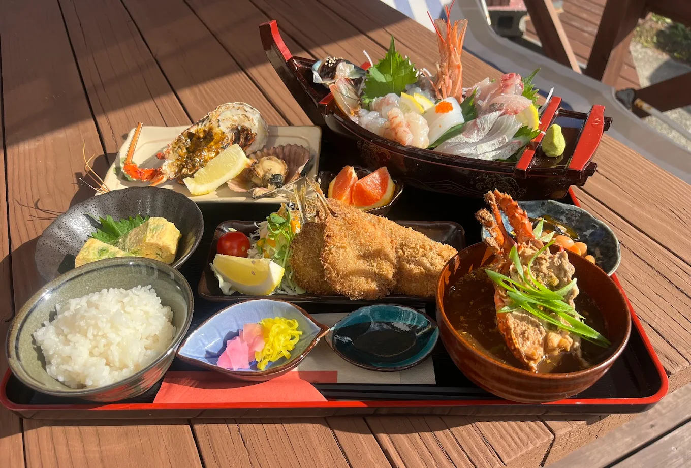 新鮮な魚料理だけでなく、チキンステーキやポークステーキ、牛丼、カレーなどの洋食メニューも充実。食後にはこだわりのコーヒーもおすすめです。アットホームな雰囲気の中、目前に広がる海を眺めながら過ごす時間は格別。観光やドライブの立ち寄りにもぴったりです。
