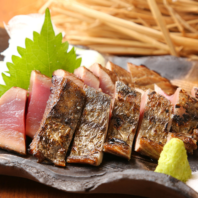 藁の炎で一気に焼き上げることで旨みを閉じ込め独特の香ばしい香りを楽しめます!煙で程よく燻された、表面の香ばしさは格別で、目の前で臨場感を感じながら焼き上げる様子は、豪快そのもの!鰹(かつお)の藁焼きや、鰆(さわら)の藁焼きなど、旬の鮮魚を仕上げます!