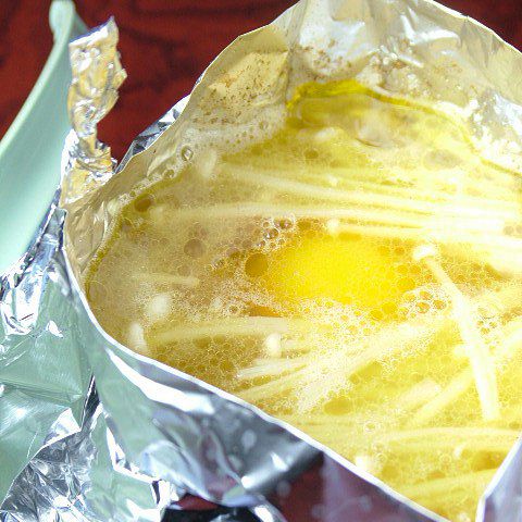むさしオリジナルスープ!アルミホイルを舟形に作り、えのき、にんにくスープ、玉子が入っています。元気の出る食材の相性が抜群の一品!