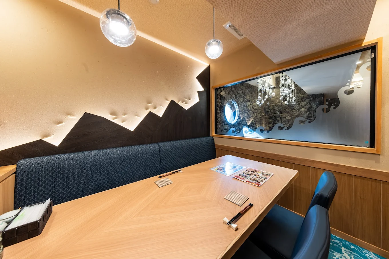 三崎まぐろや黒あわび、国産生うにを使った豪華舟盛や、金目鯛の姿煮、天ぷら盛り合わせなど、贅沢な海鮮料理が勢ぞろい。魚をモチーフにした照明やアサメラ製カウンターが彩る店内は、上品で落ち着いた雰囲気。個室完備で喫煙も可能、デートや接待、宴会にも最適です。