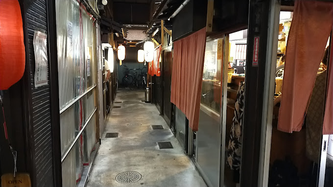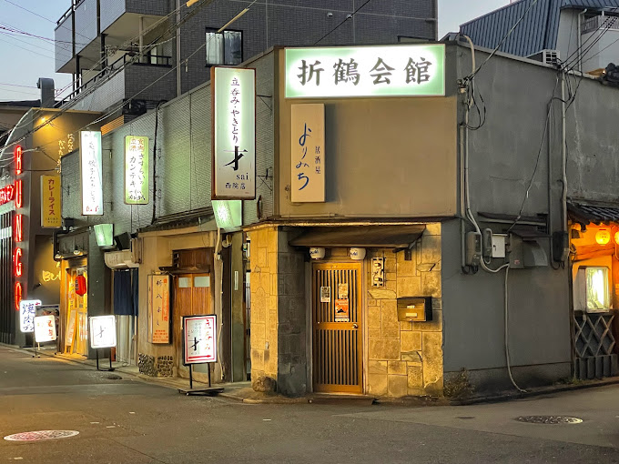 西院駅近くの折鶴会館に位置する立ち飲み屋。昭和の雰囲気が漂う店内では、タバコの香りと共に気軽に飲むことができます。串焼きや唐揚げが特に人気で、1本から頼めるのが嬉しいポイントです。
