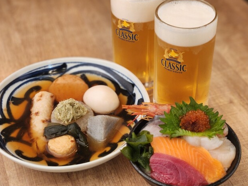 「彩ノ匠」では、1000円でおでん7種と生ビールのセットが楽しめるお得な「せんべろ」や、2000円で海鮮丼とビールを堪能できるセットが人気。美味しい料理とともに、楽しいひとときを過ごせます。