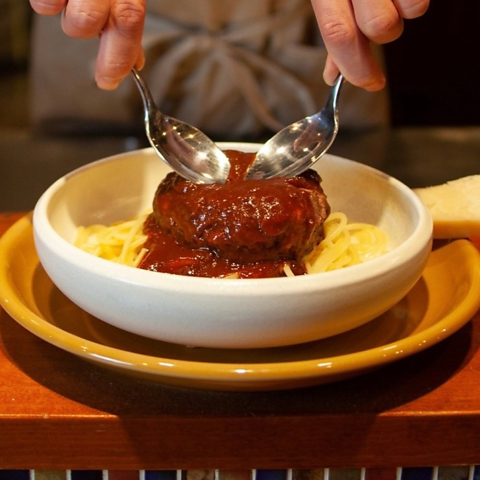 食べ応え満点の新メニューです◎こちらはご注文を頂くと、パスタに乗った和牛ハンバーグを目の前で崩し、パルミジャーノチーズを上からたっぷりかけてお召し上がり頂きます!見ても楽しい、食べて美味しい自慢の一品です♪