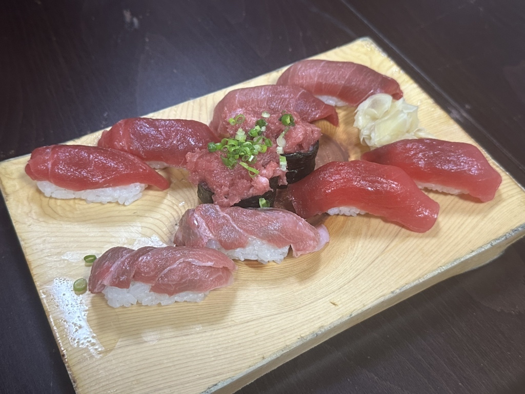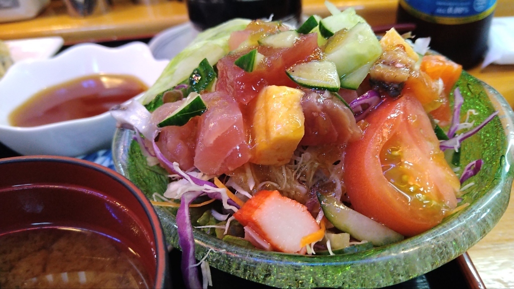 寿司定食では、握り寿司に加えて選べる天ぷらやとんかつが付いてきます。さらに、茶碗蒸し、もずく酢、赤味噌の汁もセットに。ボリューム満点の食事が楽しめます。