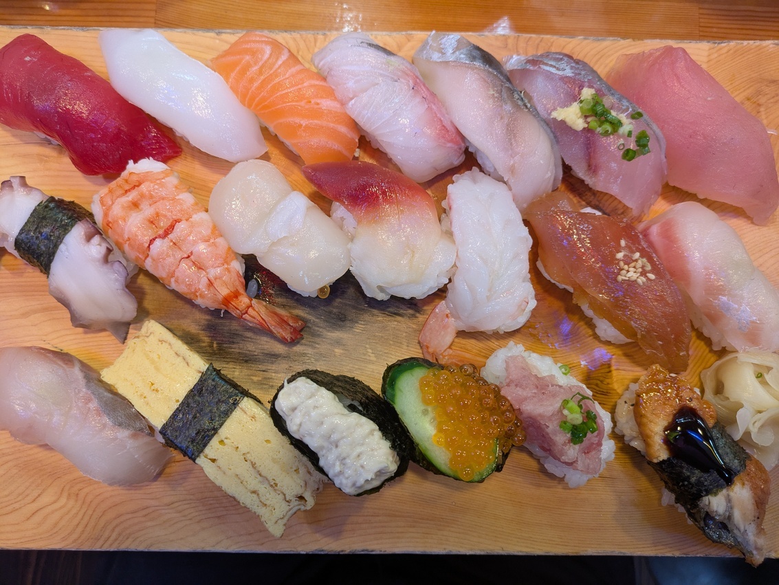 一度に20貫の握り寿司とお椀が楽しめる「メガにぎり20カン盛り」。1,680円というリーズナブルな価格で、一カンずつ異なるタネが食べ飽きさせません。