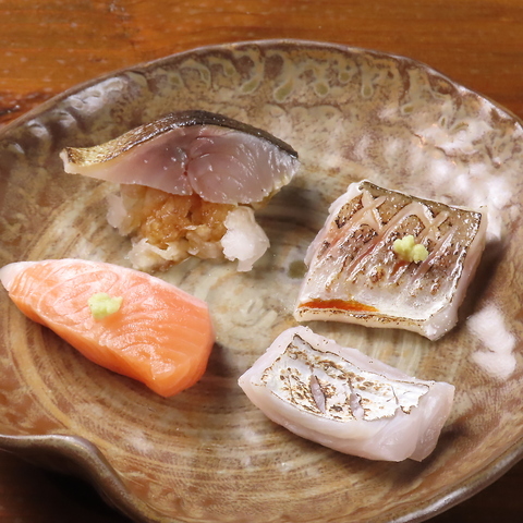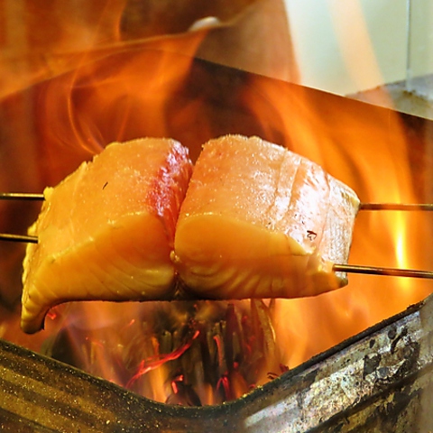旬の鮮魚を一切れずつご提供できます。ご注文を頂いてから藁焼にいたします。焼きたての藁の香りを存分にお楽しみください。特製醤油、特製塩、山葵、ニンニクでお召し上がりください。
