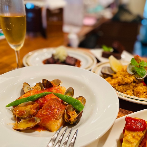 南欧各地で修行したシェフが腕を振るう料理の数々をお楽しみください。魚介の出汁をしっかりと取ったパエリアは人気の定番メニュー!ムール貝やエビ、あさりなどたっぷりの魚介とともに炊き上げます!