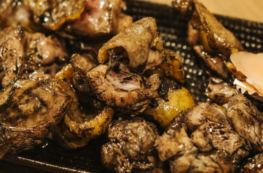 店内の焼き場で豪快な火柱とともにレアに仕上げる名物「ももの炭火焼き」 お一人様大歓迎 カウンター席あります。日曜営業の場合は16時からやっちょります。