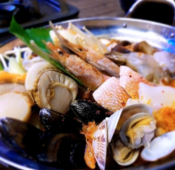 海鮮たっぷりの海鮮鍋です。プラスで〆にラーメンセットか雑炊セットも付けられますのでお気軽にスタッフまでお申し付けください!