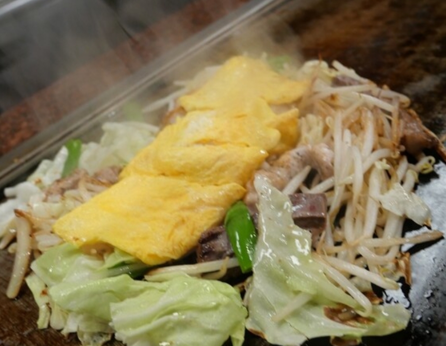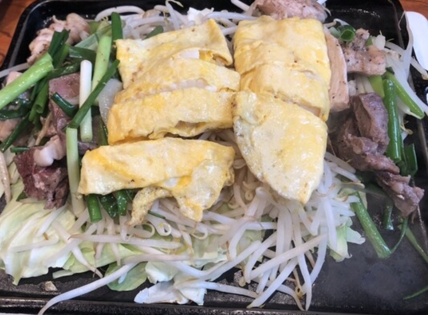 牛・豚・鶏・イカの卵焼きとたっぷり野菜を鉄板で混ぜて焼く自由なスタイルが特徴のお店。コチュジャンやもみじおろし入りの特製タレが絶妙で、ご飯の量も調整でき、ガッツリ食べたい人にもぴったりです。