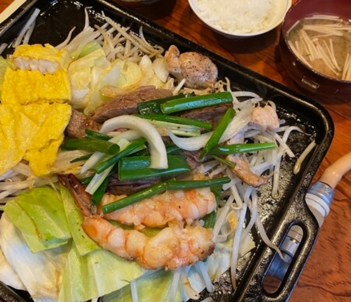 肉はもちろん、エビ・イカ・ホタテなど魚介も注文でき、鉄板で豪快に焼き上げるスタイルが人気。和風ポン酢ベースのタレが具材の旨みを引き立て、白米が止まらないほどの食べ応えがあります。