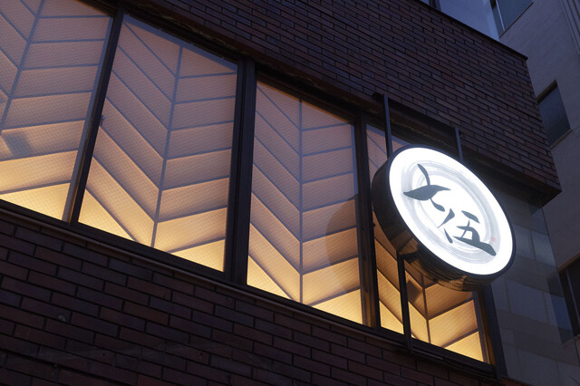 【七伍】はビルの2階にあるため、夜には窓に映る明かりを外から眺めることができます。室内の楽しげな様子が滲み出しそうな柔らかな明かり。初めての方も、気軽にお入りください。