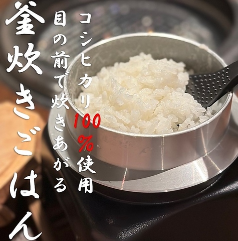 三重県産コシヒカリを100%使用した釜炊きごはん。お米一粒一粒を味わえる最高の一杯をご用意。1合(約330g)440円、2合(約660g)748円となります。ご注文をいただいてからの炊き上げとなりますので、お時間20分程いただきます。