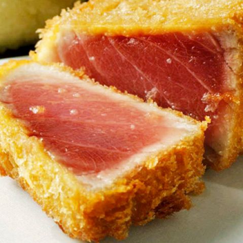 新宿牡蠣入レ時 名物の「トロカツ」!中はレアのままさっと揚げました。ほんのり温かく外はサクッと中はレアなマグロの食感にトロの甘味が最高!シンプルに塩とワサビおろしで召し上がれ!