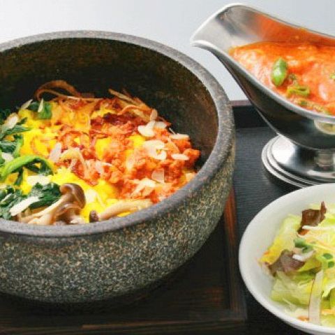 出来立ての熱々の石焼の上には特製サフランライスに季節のキノコ・ほうれん草・揚げたまねぎが豊富に乗っています!