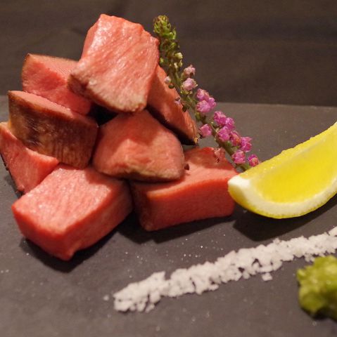 2日かけて仕込む自慢の牛タン。低温調理で調理するからこそ、お肉の本来の味と香りをお愉しみ頂きます。1番美味しいタンもとのみ使用しています。熟成岩塩とわさびで!