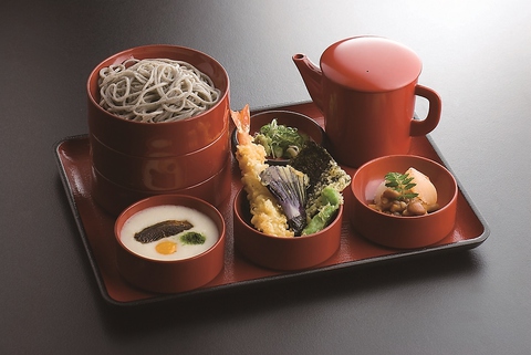 胡麻の風味が香る胡麻切りそばの割子そばが三段。三種類(天ぷら・とろろ芋・そばの実なめこおろし)の違った味をお楽しみ下さい。