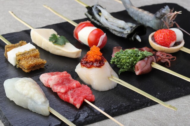 定番の串カツや季節の串など、8種類の串が入った充実の串コースをご用意!エビや牛の串はもちろんのこと、お客様のお好みに合わせてお召し上がりいただけます。季節に合わせた食材を使用しており、四季の味わいを感じられる内容になっておりますので落ち着いた雰囲気の店内で揚げたての串カツをお楽しみ下さいませ!