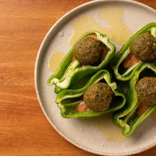 ひよこ豆のファラフェルsovでは自家製胡麻ソースと新鮮なピーマンと一緒に召し上がって頂いてます!ランチは新鮮な鎌倉野菜を。ディナーは『ナチュラルワインと小皿料理』を!