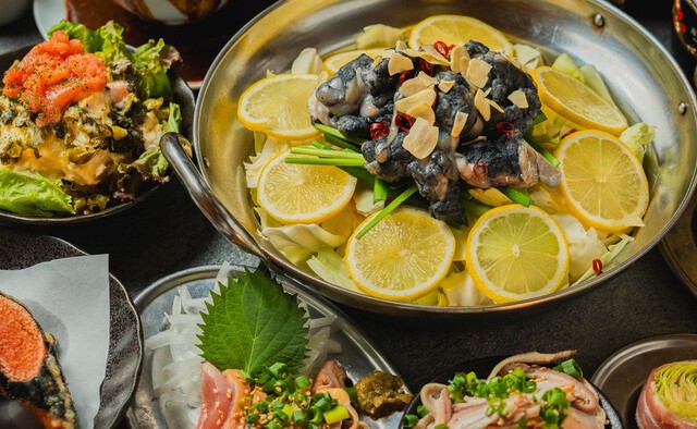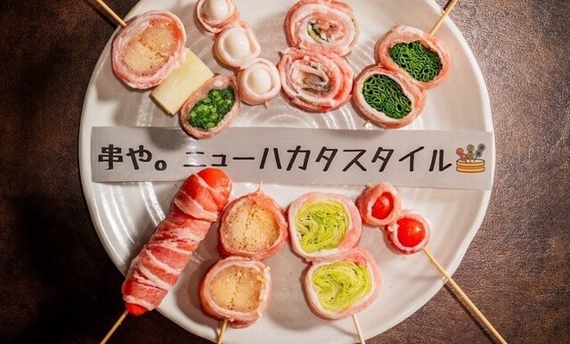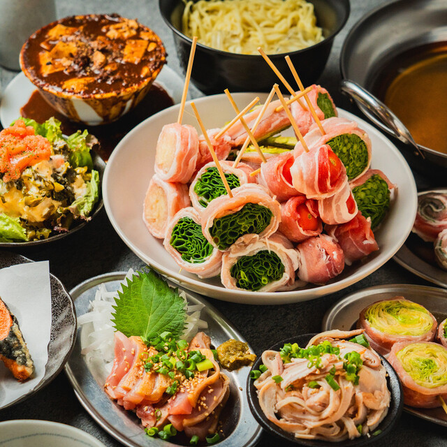 種類豊富な野菜を豚バラで巻き、炭火で香ばしく焼き上げる名物の野菜巻き串。豚の甘みと野菜の旨味が絶妙に重なり合う自慢の一品です。明太子やうずらの卵を巻いた串、鶏皮ぐるぐる串など多彩な串料理も充実。九州の味を気軽に堪能できるネオ大衆居酒屋です。