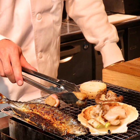 ライブ感を楽しんでいただけるカウンター席で、楽しんでいただけます!北海道産「灰干しさんま」、大阪特産「鴨川ロースの炙り」など、天然イノシシのもも肉塩焼きなど定番以外の炭焼きを楽しめます!